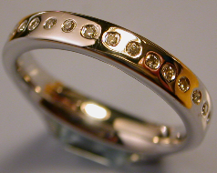 In the case of this particular ring the stones were all set on top of the band making it easy to add a plain band wedding ring when the time came.