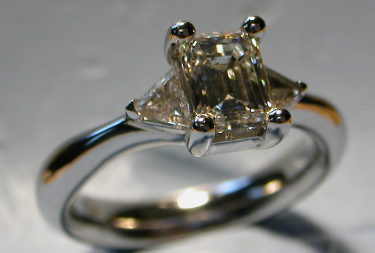 The stones are emerald cut (centre) and 2 triangle stones (both sides).
