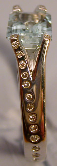 This lovely 3ct Aquamarine stone is flanked by diamonds completely around the shank of the ring.