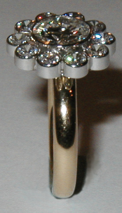 This 18ct White & Yellow gold ring has a 1.25ct centre stone surrounded by 10 smaller diamonds totalling 81 pts